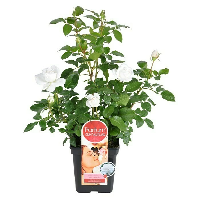 Die Edelose (Rosa) Annapurna ist eine reichblühende, gesunde Rose, die in keinem Garten fehlen darf. Die Blüten sind reinweiß, stark gefüllt und erscheinen in großer Anzahl von Mai bis Oktober. Diese verströmen einen angenehmen Duft, der sich an sonnigen, warmen Tagen besonders entfaltet. Diese Sorte wächst buschig bis zu einer Höhe von 80cm. Sie ist auch als Schnittrose für die Vase gut zu verwenden.Damit sie gut zur Geltung kommt, braucht die Königin der Blumen die richtigen Begleiter: Niedrig wachsende Stauden, Lavendel und Salbei sind besonders zu empfehlen.